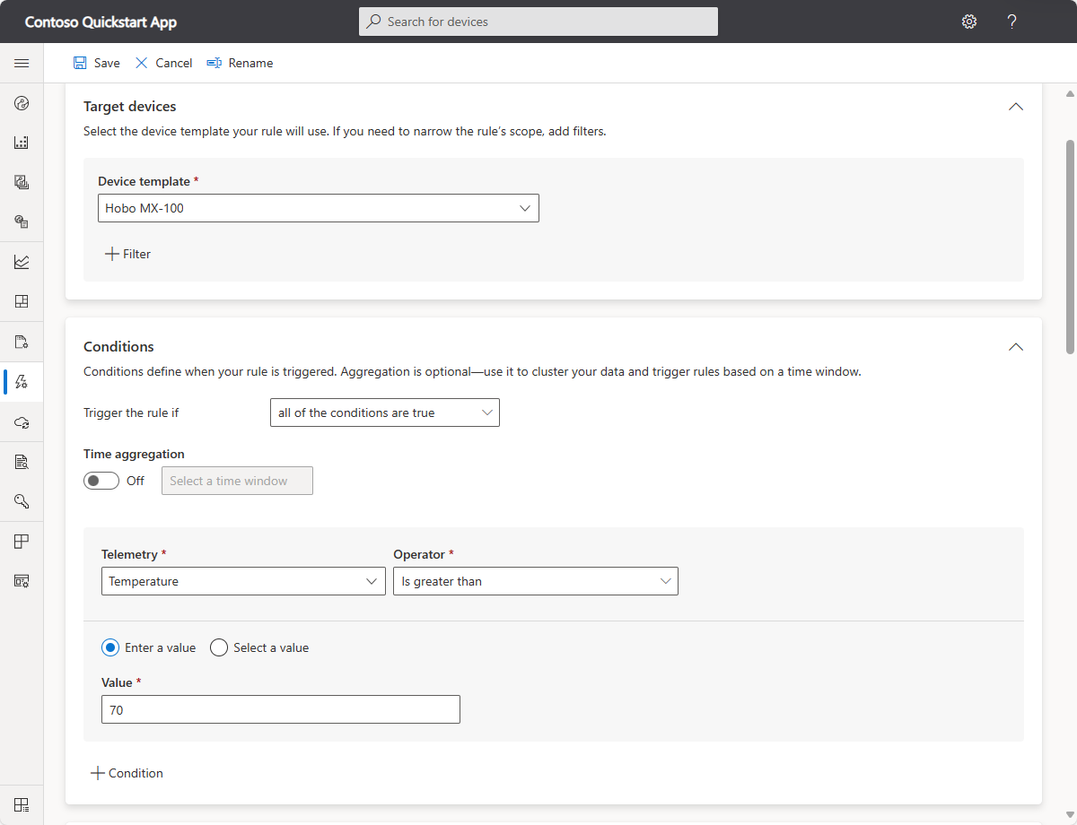 Les conditions définissent les critères que la règle surveille. Dans ce tutoriel, vous allez configurer la règle à déclencher lorsque la température dépasse 70° F.