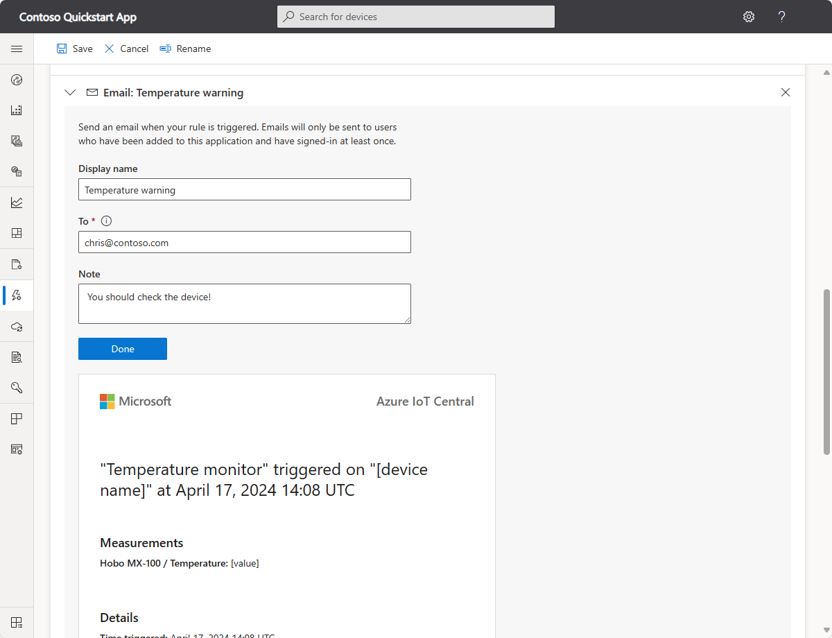 Entrez Avertissement de température comme nom d’affichage de l’action, votre adresse e-mail dans le champ À, et Vous devriez vérifier l'appareil ! comme note à afficher dans le corps de l’e-mail.