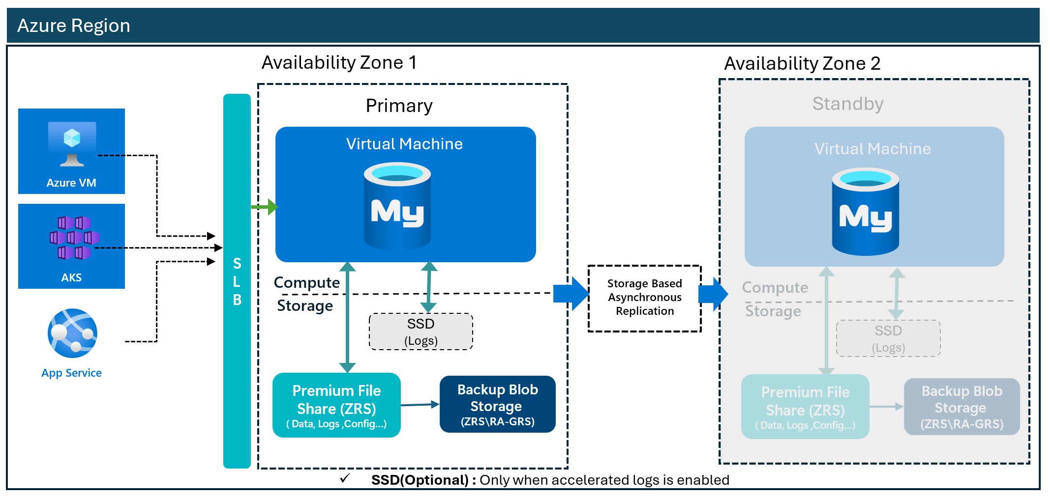 Les fichiers de données et les fichiers journaux sont hébergés dans un stockage redondant interzone (ZRS). Le serveur de secours lit et relit en continu les fichiers journaux à partir du compte de stockage du serveur principal, qui protège la réplication au niveau du stockage.