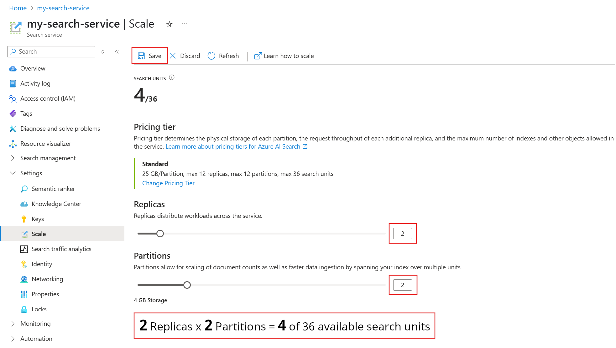 Sur les services de recherche créés après le 3 avril 2024 dans les régions prises en charge, les services de base peuvent avoir jusqu'à trois partitions et trois réplicas. La limite maximale d’unités de stockage (SU) est de neuf pour prendre en charge un ensemble complet de partitions et de réplicas.