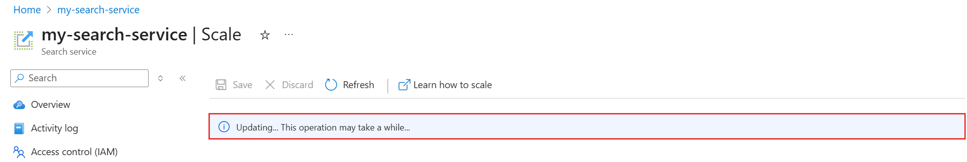 | « Les opérations de mise à jour de service ne sont pas autorisées pour l’instant, car nous traitons une demande précédente. » | Une autre opération de mise à l’échelle est en cours. | Consultez la page Vue d’ensemble dans le portail Azure ou utilisez l’API REST Gestion des recherches, Azure PowerShell ou Azure CLI pour obtenir l’état de votre service de recherche. Si l’état est « En cours de provisionnement », attendez qu’il devienne « Terminé avec succès » ou « Échoué » avant de tenter à nouveau. 1, 2 |