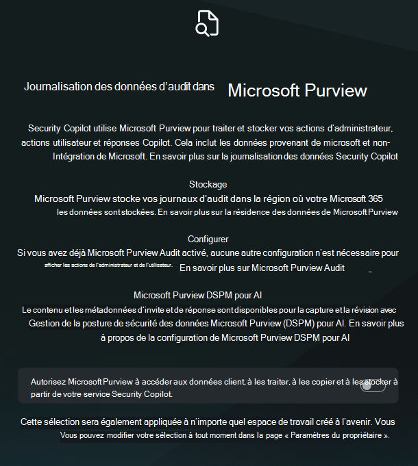 Pour activer Purview DSPM pour les solutions IA et UAL pour Security Copilot, la fonctionnalité doit être activée dans Security Copilot et configurée dans les solutions Purview respectives. Il existe deux options pour activer les fonctionnalités dans Security Copilot. Au départ, lors de la première exécution, un administrateur de sécurité peut choisir d’autoriser Microsoft Purview à accéder, traiter, copier et stocker des actions de l’administrateur, des actions utilisateur et des réponses Copilot. Pour plus d’informations sur la prise en main de Security Copilot consultez Prise en main de Security Copilot.
