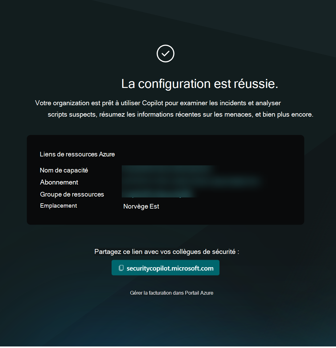 Lorsque vous ouvrez pour la première fois Security Copilot (https://securitycopilot.microsoft.com), vous êtes guidé à travers les étapes de configuration de la capacité de votre organization.