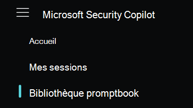 Les promptbooks prédéfinis et créés par l’utilisateur dans votre organization s’affichent dans les promptbooks. Affichez les guides en accédant au menu Security Copilot et en sélectionnant Promptbooks. Pour afficher la liste des promptbooks prédéfinis disponibles dans Security Copilot, consultez Essayer des guides.