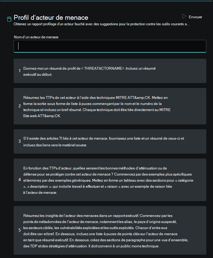 Pour exécuter le promptbook du profil d’acteur de menace :