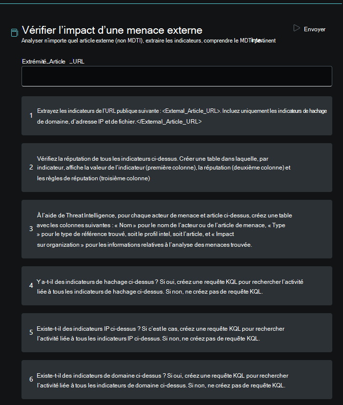 Fournissez l’URL de l’article de renseignement sur les menaces externe à partir duquel vous souhaitez analyser et extraire des indicateurs.