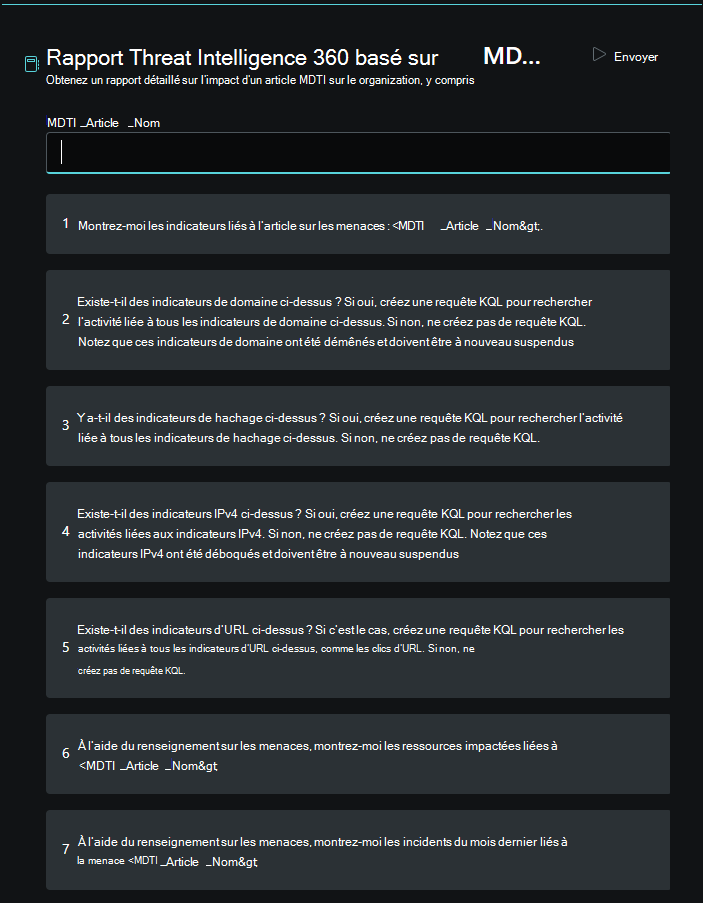 Sélectionnez le promptbook nommé Rapport Threat Intelligence 360 basé sur l’article MDTI.