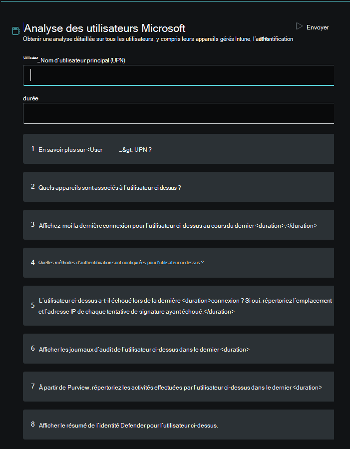 Le manuel d’invite d’analyse des utilisateurs Microsoft peut être utilisé par un Administration informatique pour analyser et obtenir des informations détaillées sur un utilisateur et les appareils associés sur plusieurs produits Microsoft 365. Cela inclut les données de connexion et d’authentification de Microsoft Entra ID, les informations sur les appareils de Intune, les détails des activités inhabituelles de Microsoft Purview et un résumé Microsoft Defender mettant en évidence les détections importantes.