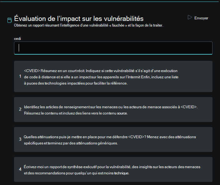 Le promptbook d’évaluation de l’impact sur les vulnérabilités accepte un numéro CVE ou un nom de vulnérabilité connu pour déterminer si la vulnérabilité a été divulguée ou exploitée publiquement et si elle a été utilisée par les acteurs des menaces dans leurs campagnes. Il peut ensuite fournir des recommandations pour traiter ou atténuer la menace et résumer ces résultats dans un résumé exécutif.