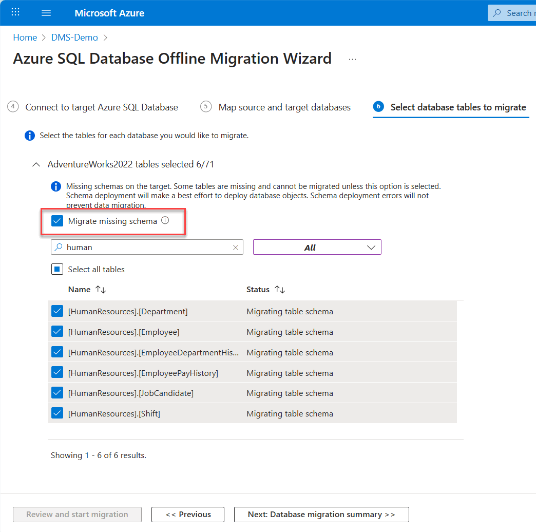 Ensuite, utilisez Sélectionner toutes les tables pour migrer toutes les tables, ou utilisez la zone d’entrée de texte pour filtrer la liste des tables et sélectionner des tables individuelles à migrer. Ensuite, sélectionnez Suivant : Résumé de la migration de base de données.