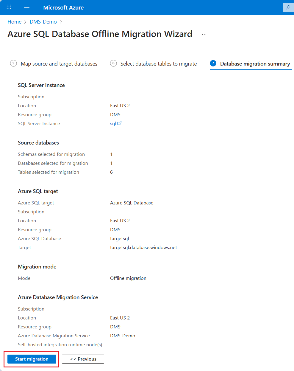 Sous l’onglet Résumé de la migration de base de données , passez en revue les détails, puis sélectionnez Démarrer la migration, qui démarre la migration de base de données et vous ramène automatiquement au tableau de bord Database Migration Service.