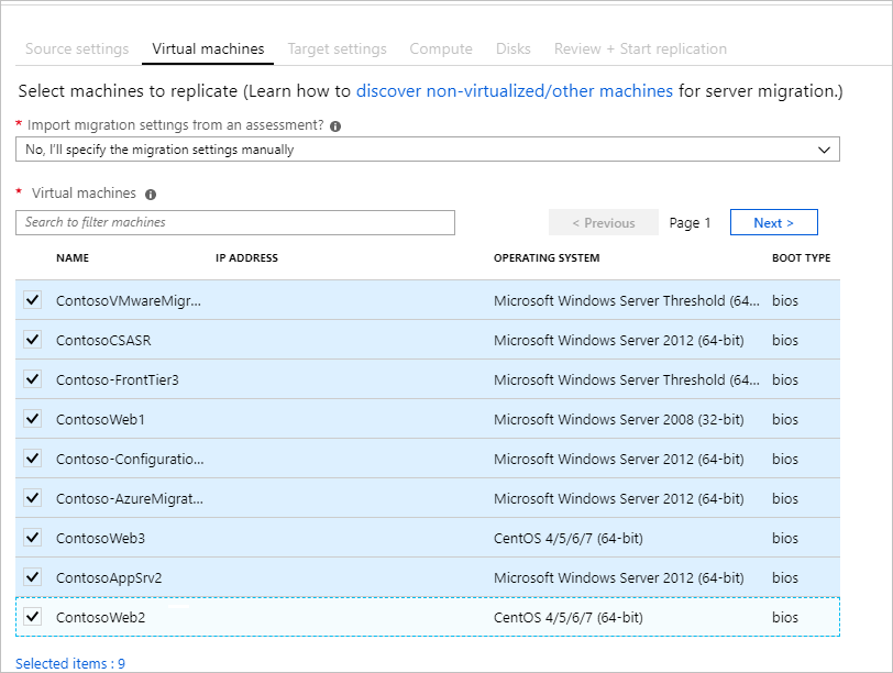 À présent, sélectionnez les machines pour la migration. Vous pouvez répliquer ensemble jusqu’à 10 machines. Si vous avez besoin d’en répliquer davantage, répliquez-les simultanément par lots de 10.