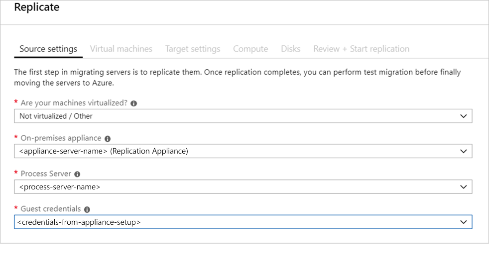 Dans Répliquer>Paramètres de la source>Vos machines sont-elles virtualisées ?, sélectionnez Physiques ou autres (AWS, GCP, Xen, etc.).