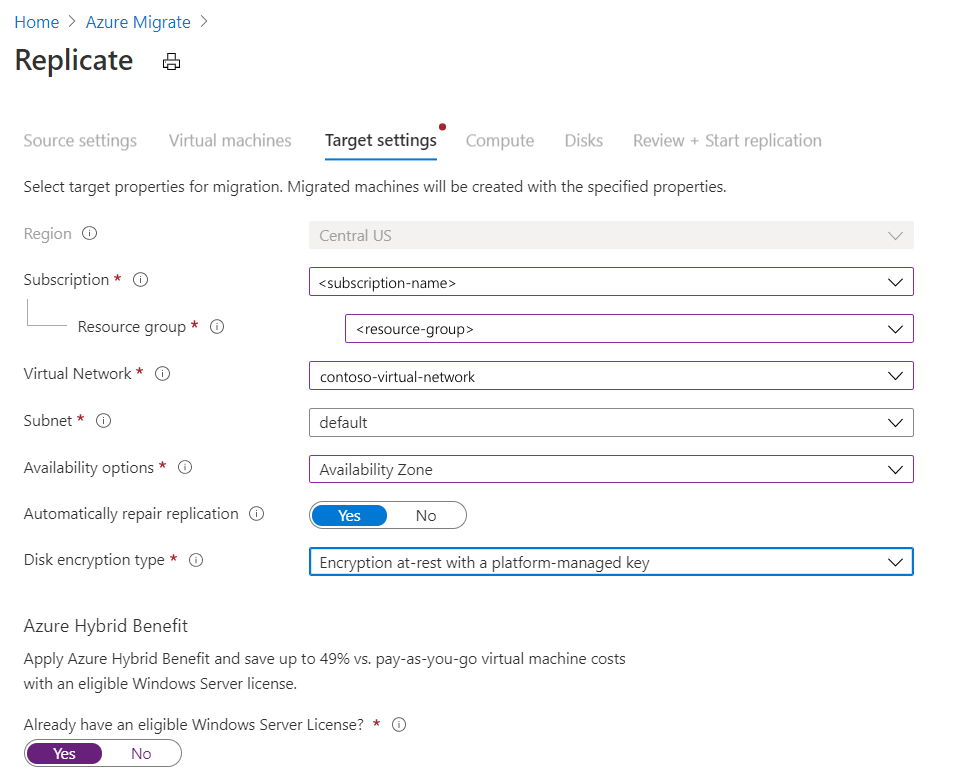 - Si vous avez déjà configuré la migration avec Azure Migrate Migration de serveur, l'option cible ne peut pas être configurée, car les ressources ont été configurées précédemment.