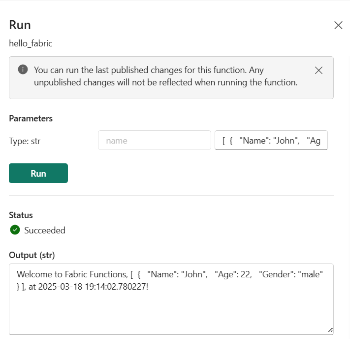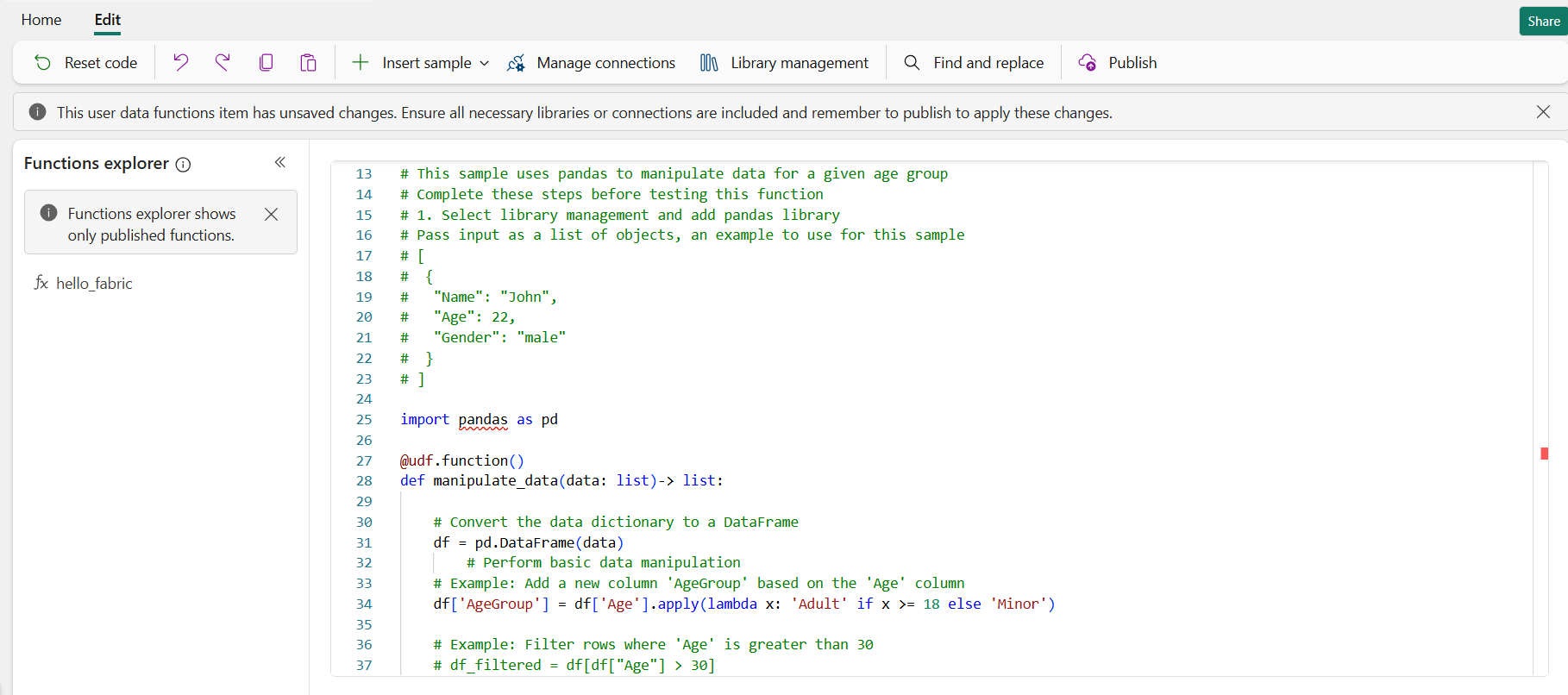 hello_fabric:hello_fabric1@udf.function() def hello_fabric1(name: str) -> str: logging.info('Python UDF trigger function processed a request.') return f"Welcome to Fabric Functions, {name}, at {datetime.datetime.now()}!"Après avoir modifié le nom, sélectionnez Publier pour enregistrer ces modifications.
