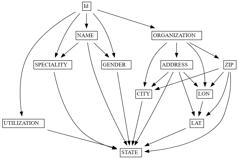 Après avoir trouvé des dépendances fonctionnelles dans un jeu de données à l’aide find_dependenciesde , vous pouvez visualiser les dépendances à l’aide de la plot_dependency_metadata fonction. Cette fonction prend le FabricDataFrame résultant de find_dependencies et crée une représentation visuelle des dépendances entre les colonnes et les groupes de colonnes.