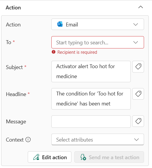 @ou en sélectionnant le bouton en regard des zones de texte. Par exemple :@BikepointID. - Pour Le contexte, sélectionnez les valeurs de la liste déroulante que vous souhaitez inclure dans la notification par e-mail.