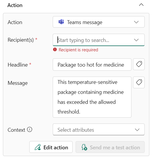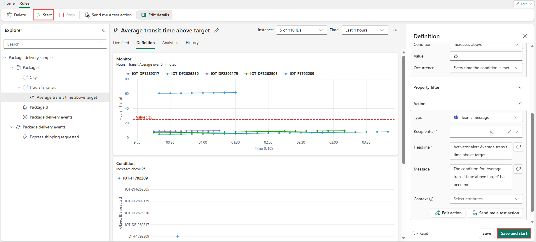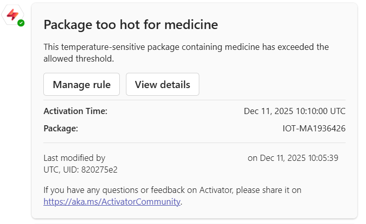Sélectionnez Démarrer. La règle devient alors active. Vous recevez un message Teams chaque fois qu’un package de médicaments est trop chaud. La règle doit se déclencher plusieurs fois toutes les heures.