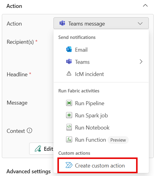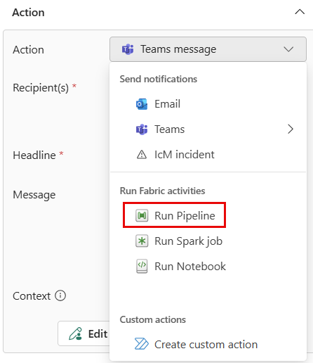 Exécuter des activités Fabric : Pour configurer l’alerte pour lancer un pipeline Fabric, un travail Spark ou un notebook lorsque la condition est remplie, procédez comme suit :