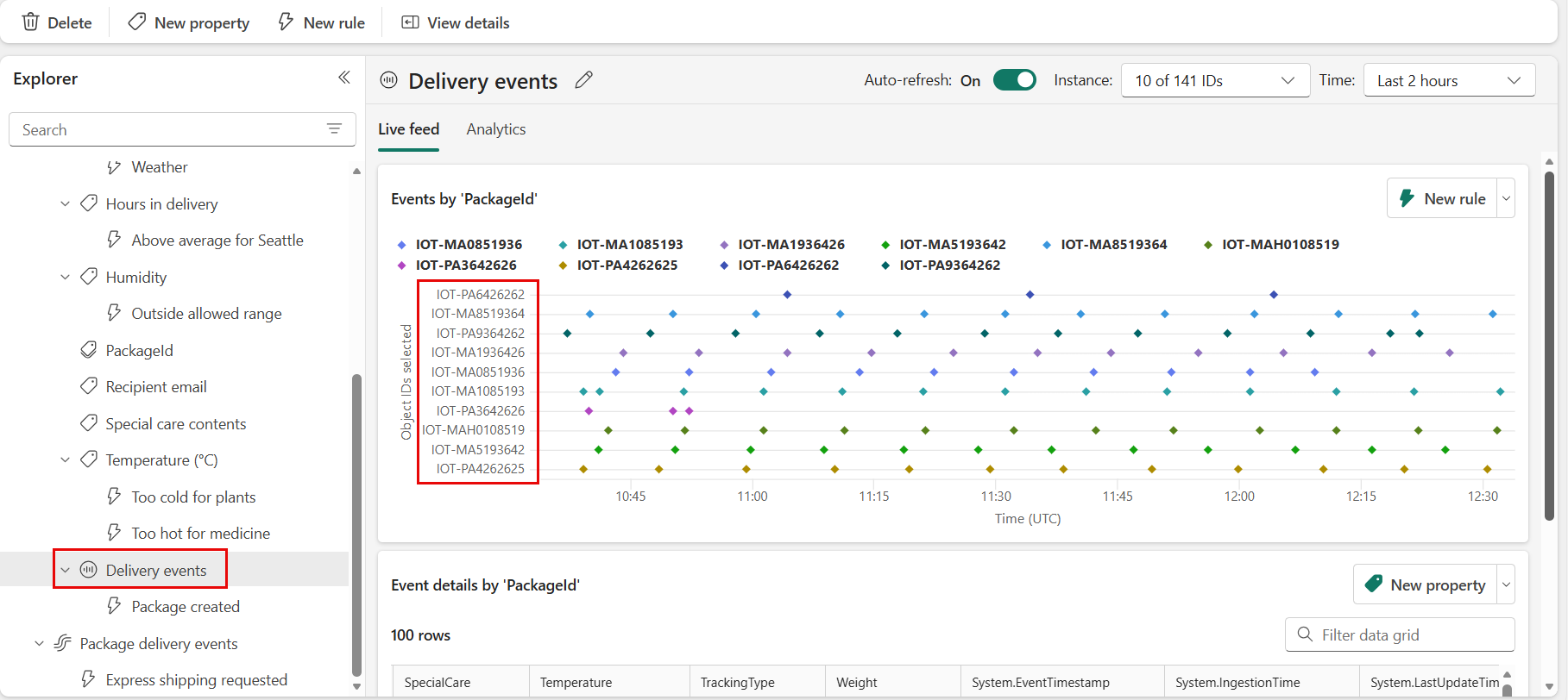 Dans le volet Explorateur, sélectionnez l’objet appelé Événements de livraison. Vous pouvez créer des règles sur les objets qui utilisent les données d’eventstream Événements de livraison de packages. Par exemple, une règle qui vérifie les packages pour la température.