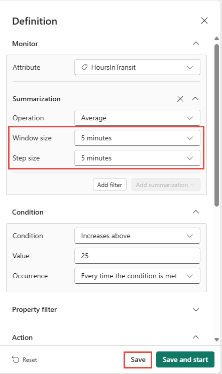 Définissez une taille de fenêtre d’agrégation de cinq minutes et une taille d’étape de cinq minutes, puis sélectionnez Enregistrer.