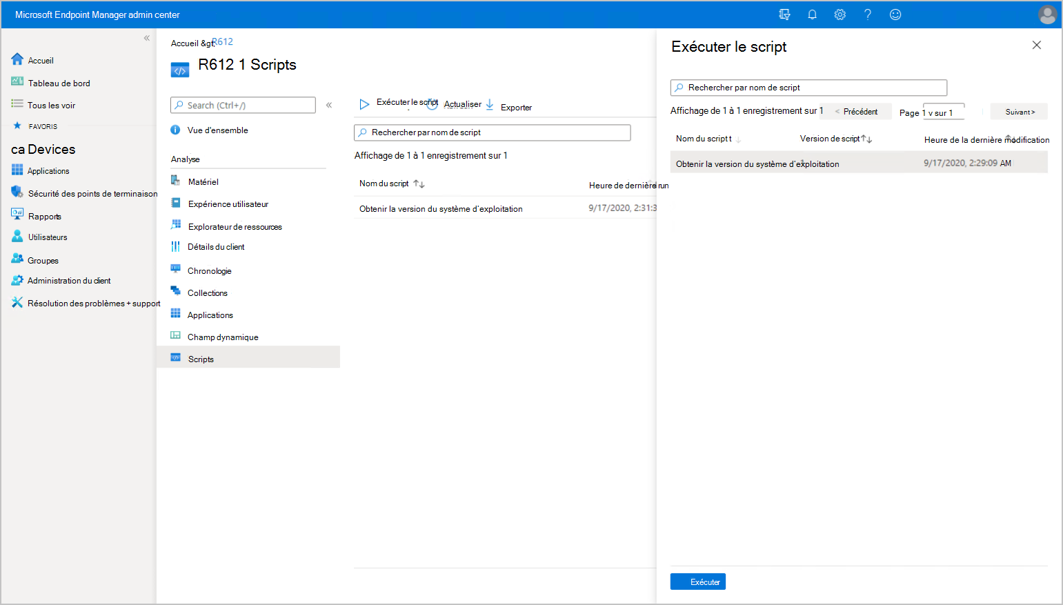 Les scripts qui ont été exécutés récemment et qui ont ciblé directement l’appareil sont déjà répertoriés. La liste comprend des scripts exécutés à partir du Centre d’administration, du SDK ou de la console Configuration Manager. Les scripts lancés à partir de la console sur site, par rapport aux collections contenant l’appareil ne seront pas affichés, sauf si les scripts ont également été lancés spécifiquement pour l’appareil unique.