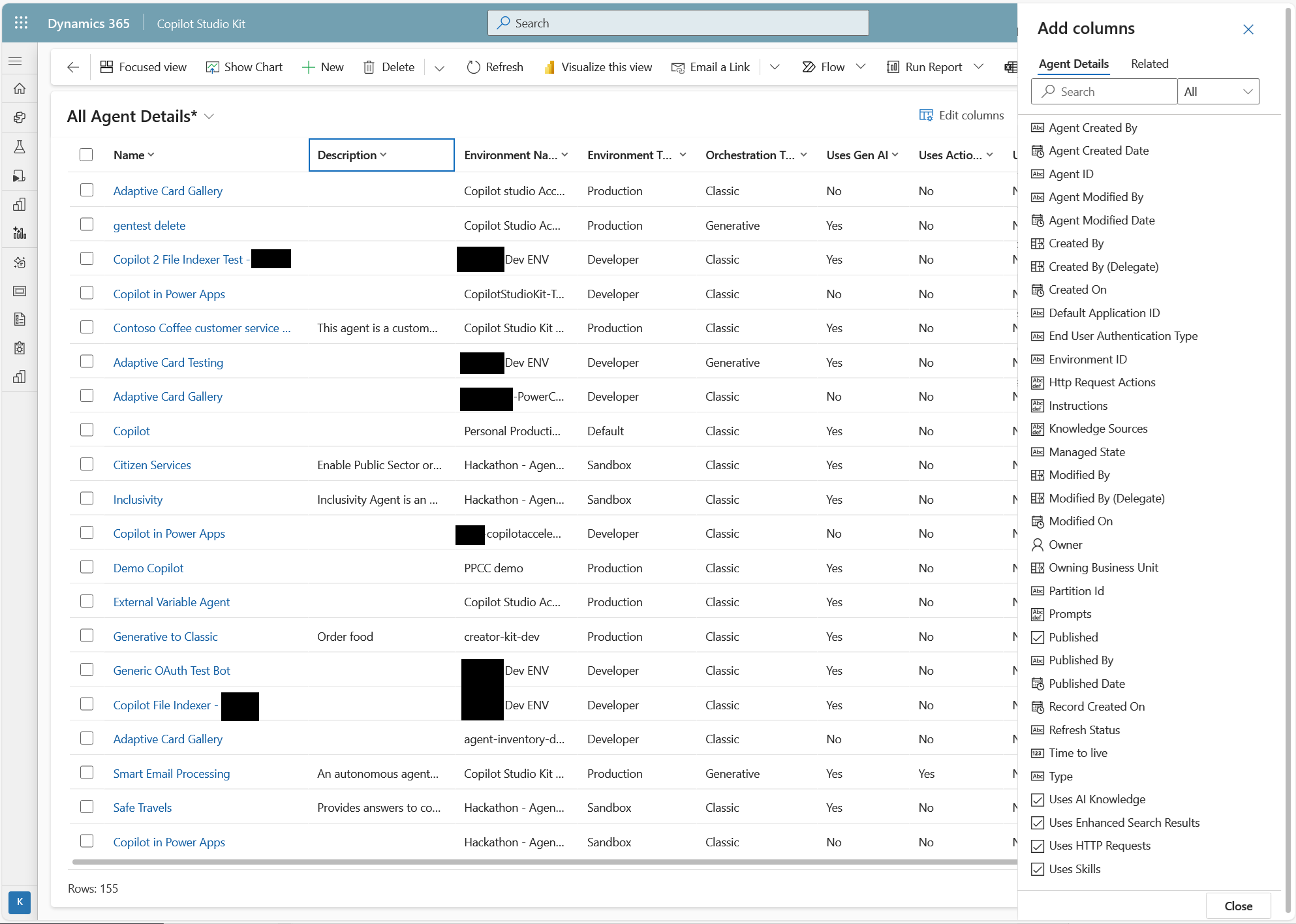 La fonctionnalité Inventaire des assistants offre aux administrateurs une visibilité à l’échelle du client sur tous les assistants personnalisés Copilot Studio de l’organisation, dans l’ensemble des environnements. Les données d’inventaire de l’agent incluent des métadonnées de base telles que les heures de création, l’état de publication et le mode d’authentification, ainsi que des informations sur l’utilisation des fonctionnalités telles que les sources de connaissances, l’utilisation rapide, le type d’orchestration, etc.