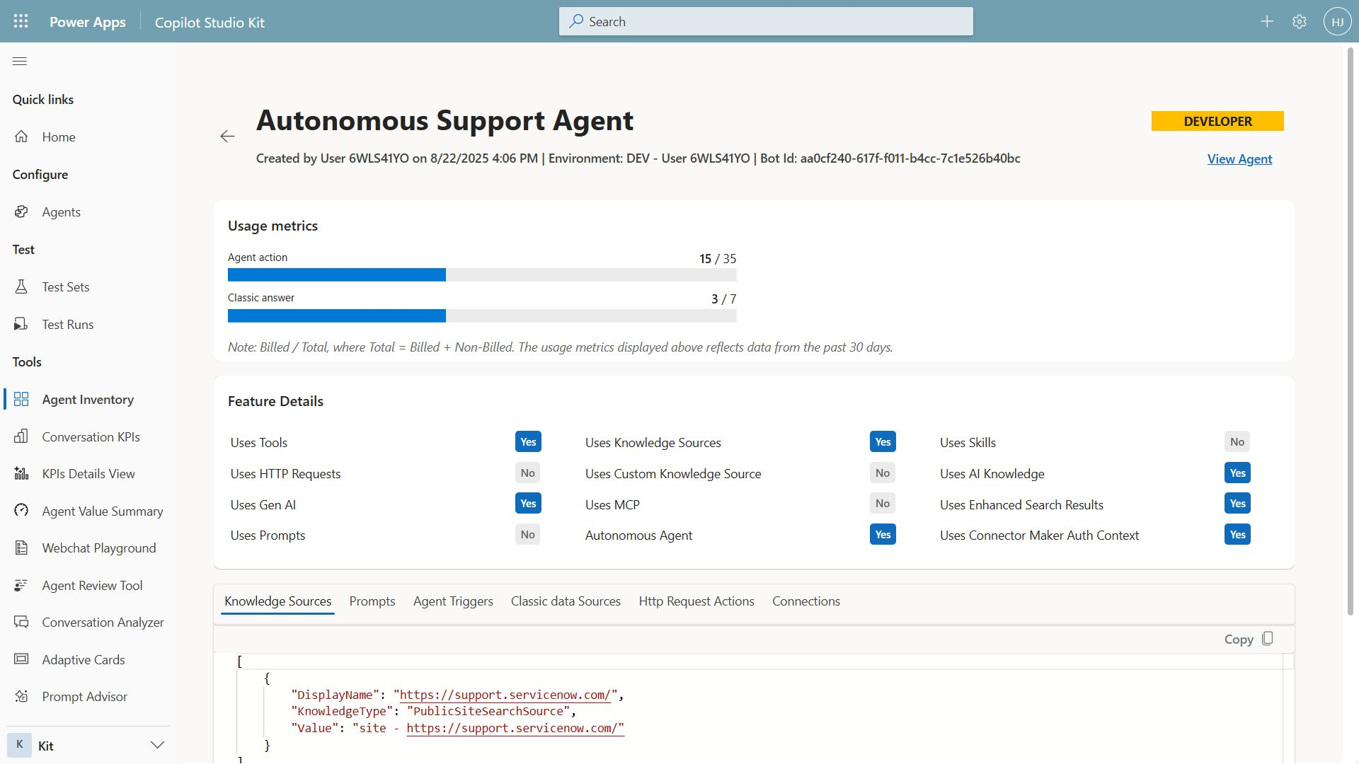Sélectionnez un agent, puis sélectionnez Afficher les détails pour afficher une vue détaillée de l’agent sélectionné. Cette vue inclut des métadonnées de base sur l’agent personnalisé, l’environnement, le temps de création, le créateur et des informations détaillées sur l’utilisation des fonctionnalités telles que les actions, l’IA générative, les compétences, les invites et les sources de connaissances.