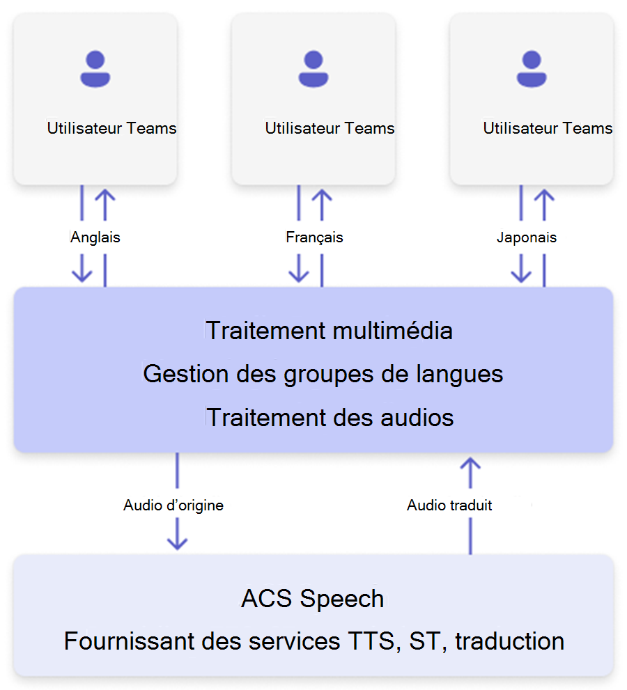 - Un bot transmet l’audio de réunion pour le traitement cloud et retourne des traductions instantanément.