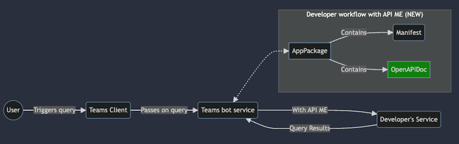 | Ce service traite la requête entrante et effectue un appel au service final du développeur. | Teams peut utiliser directement la spécification OpenAPI pour générer des demandes et communiquer avec le service final du développeur. |