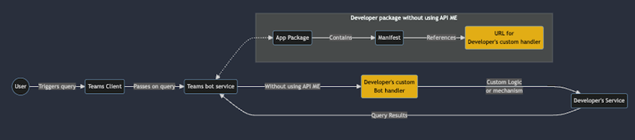 Flux de requête utilisateur utilisant des extensions de message traditionnelles. Le développeur doit gérer un service de gestionnaire de bot personnalisé, qui gère les demandes d’un bot Teams. Le service gestionnaire envoie une requête au service du développeur lorsqu’une requête est appelée.