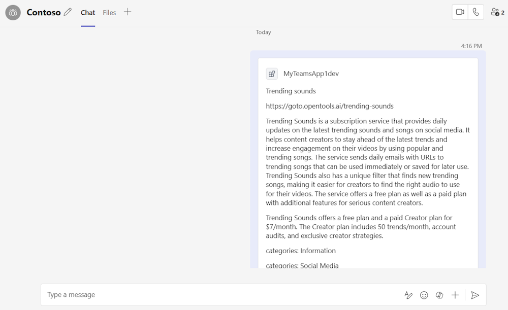 { "$schema": "https://developer.microsoft.com/json-schemas/teams/v1.17/MicrosoftTeams.schema.json", + "manifestVersion": "1.17", "version": "1.0.0", "id": "04805b4b-xxxx-xxxx-xxxx-4dbc1cac8f89", "packageName": "com.microsoft.teams.extension", "developer": { "name": "Teams App, Inc.", "websiteUrl": "https://www.example.com", "privacyUrl": "https://www.example.com/termofuse", "termsOfUseUrl": "https://www.example.com/privacy" }, "icons": { "color": "color.png", "outline": "outline.png" }, "name": { "short": "AI tools", "full": "AI tools" }, "description": { "short": "AI tools", "full": "AI tools" }, "accentColor": "#FFFFFF", "composeExtensions": [ { + "composeExtensionType": "apiBased", + "authorization": { + "authType": "apiSecretServiceAuth ", + "apiSecretServiceAuthConfiguration": { + "apiSecretRegistrationId": "9xxxxxxx-7xxx-4xxx-bxxx-1xxxxxxxxxxx" + } + }, + "apiSpecificationFile": "aitools-openapi.yml", "commands": [ { "id": "searchTools", "type": "query", "context": [ "compose", "commandBox" ], "title": "search for AI tools", "description": "search for AI tools", "parameters": [ { "name": "search", "title": "search query", "description": "e.g. search='tool to create music'" } ], + "apiResponseRenderingTemplateFile": "response-template.json" } ] } ], "validDomains": [] }