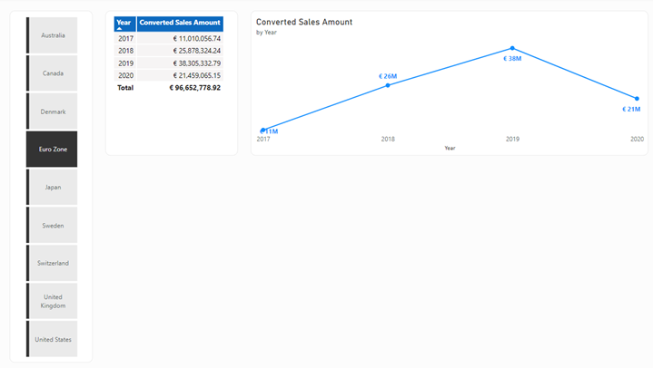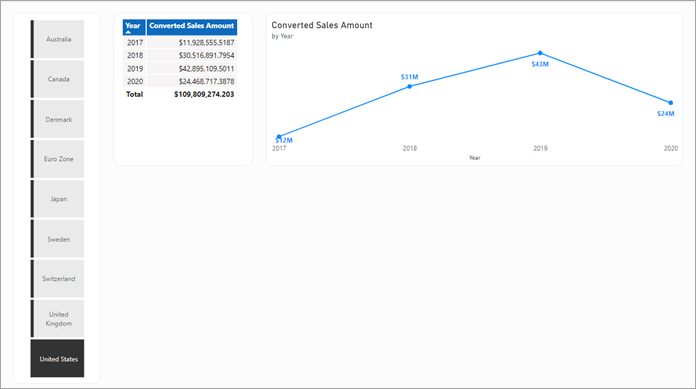 Sélectionnez un autre pays/région dans le segmenteur. Les visuels de tableau et de graphique en courbes affichent désormais le montant monétaire converti, au format correct, pour ce pays/région ou région. Essayez de sélectionner un autre pays/région dans le segment pour voir comment les visuels changent.