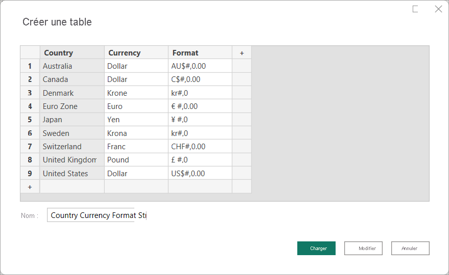 Dans la boîte de dialogue Créer une table , entrez les chaînes de format monétaire pays/région dans le champ Nom , puis copiez et collez le tableau suivant :