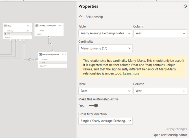 Au lieu de cela, créez une relation entre Taux de change moyens annuels et Date dans la colonne Année.