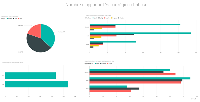 L’exemple intégré Analyse des opportunités contient un tableau de bord, un rapport et un modèle sémantique pour une société logicielle qui a deux canaux de vente : direct et partenaire. Le responsable des ventes a créé ce tableau de bord pour suivre les opportunités et les revenus par région, taille de transaction et canal.