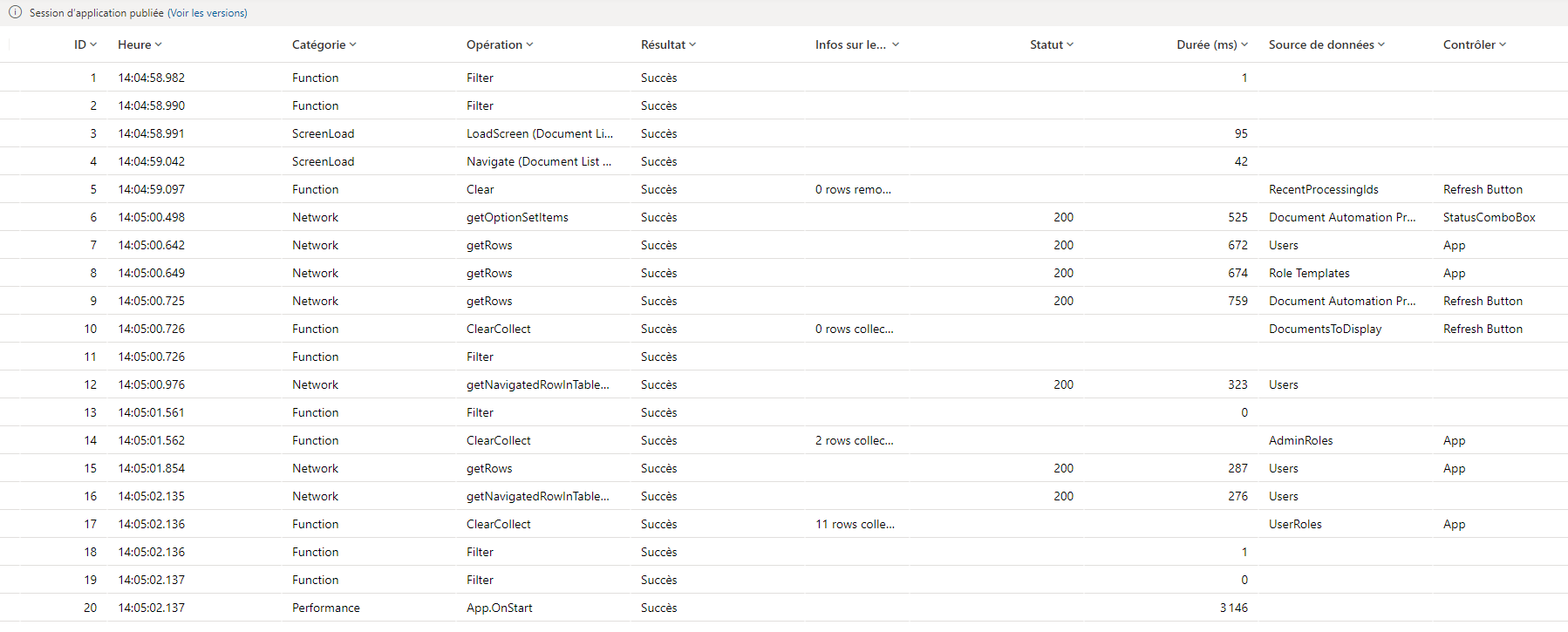 Select, ,Load ScreenNavigate, etGetRows.Résultat et informations sur le résultat, qui indiquent si l’appel est un succès, un échec ou un avertissement. Les informations de résultat incluent des informations telles que le nombre de lignes retournées, les erreurs d’exécution telles que 404 ou 429, etc.