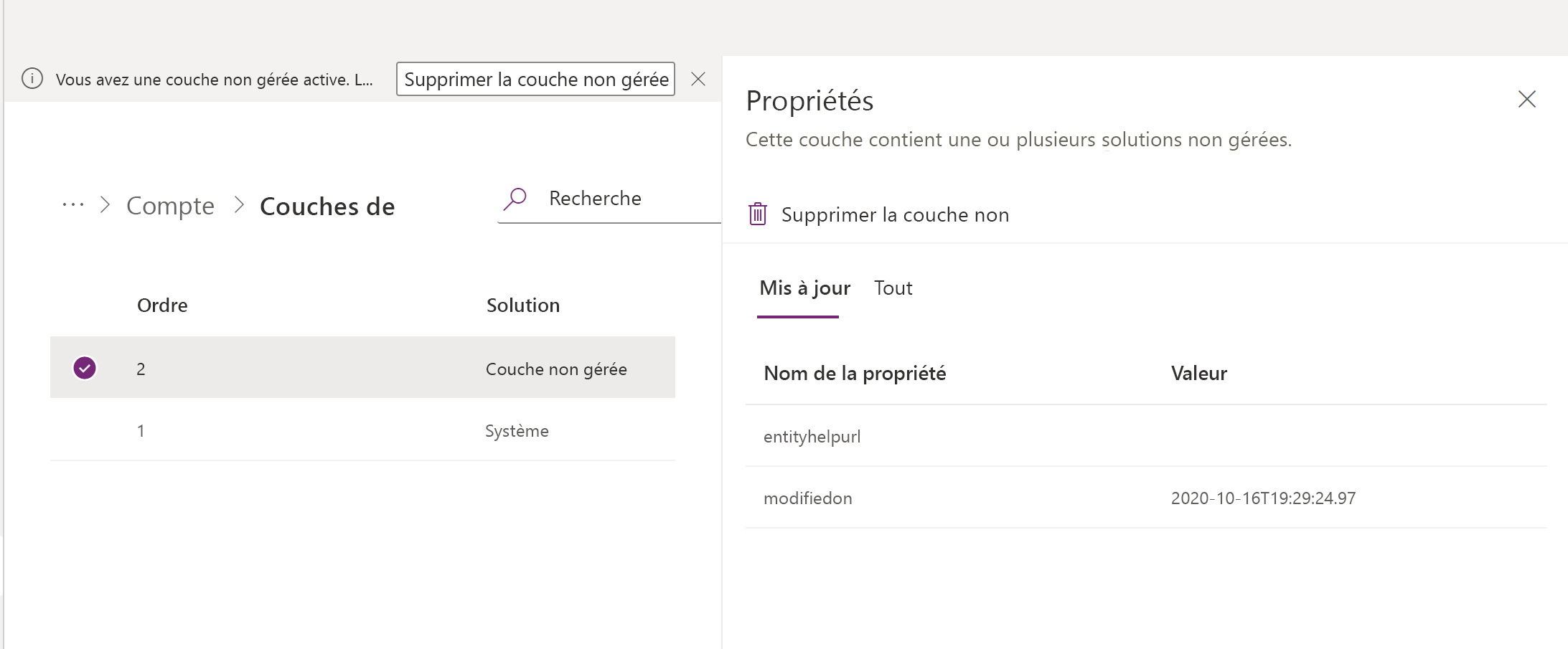 - Si la couche non managée que vous souhaitez supprimer est la seule couche et, par exemple, la couche de base du composant, vous ne pouvez pas la supprimer avec la commande supprimer les personnalisations actives. Pour supprimer la couche, vous devez supprimer le composant non managé. Plus d’informations : Supprimer des objets d’une solution.