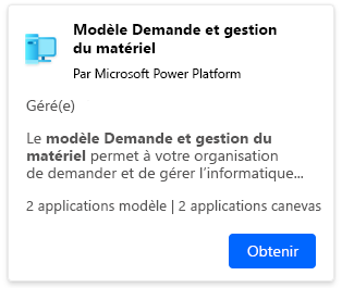 Alors que les créateurs parcourent la page Découvrir et trouver des éléments de catalogue qui leur sont utiles, ils peuvent acquérir ces artefacts et en installer une copie dans leur environnement pour commencer à les utiliser ou à les créer. Sélection Obtenir sur n’importe quel modèle ou élément géré, ouvre une fenêtre contextuelle de détails contenant des informations telles que la description, les liens, les composants inclus, les catégories d’entreprise, les captures d’écran extensibles, etc.