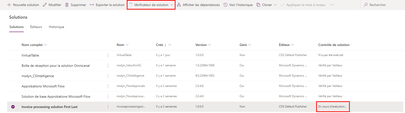 Le bouton de commande Vérificateur de solution a un indicateur de chargement et vous remarquerez un état En cours d’exécution… dans la colonne Vérification de solution de la liste Solution.