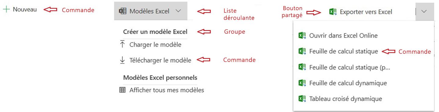 - Commande. Bouton Standard. Effectue une action lorsqu’il est sélectionné. Peut également être imbriqué dans des groupes dans des listes déroulantes et des boutons partagés. Notez que ceux-ci étaient appelés menus volants dans les commandes classiques.