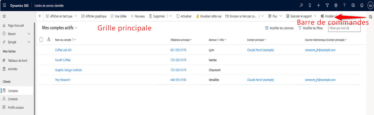 Grille principale. Cette barre de commande s’affiche lors de l’utilisation de la navigation gauche d’une application pour afficher une liste pleine page des enregistrements de cette table.