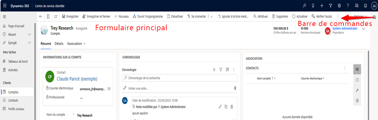 Formulaire principal. Cette barre de commandes s’affiche sur les formulaires principaux de la table. Elle apparaît en haut du formulaire et n’est pas la même que la vue associée ou la vue de sous-grille qui apparaît dans différentes zones du formulaire.