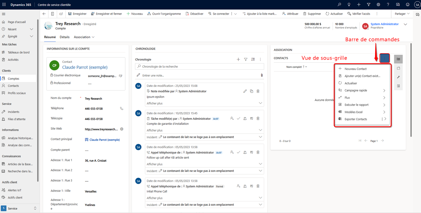 Vue de sous-grille. Cette barre de commande s’affiche sur les formulaires d’autres tables qui affichent les données de cette table dans une sous-grille. Par exemple, le formulaire principal du compte a un contrôle de sous-grille qui répertorie les enregistrements de contact liés à l’enregistrement de compte. Pour modifier la barre de commandes illustrée ici, modifiez la barre de commandes pour la table de contacts, puis la vue de sous-grille.