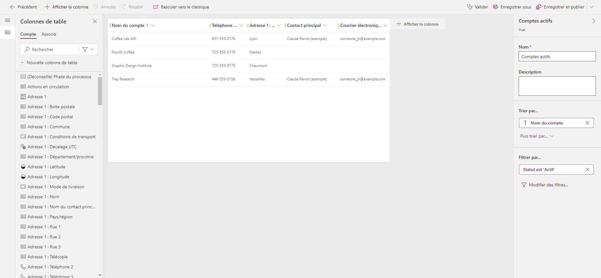 - Vue publique – Les vues publiques sont des vues d’usage général que vous pouvez personnaliser comme bon vous semble. Elles sont importantes, car tous les utilisateurs de l’application peuvent y accéder, lorsqu’elles sont disponibles, à l’aide du sélecteur de vue. Il est possible d’utiliser des vues publiques dans les sous-grilles d’un formulaire ou sous forme de liste dans un tableau de bord.