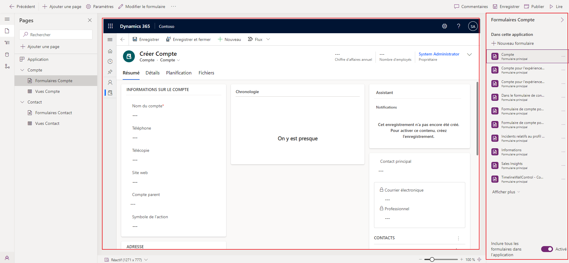 Notez que le volet d'aperçu affiche votre application. Lorsque vous sélectionnez un composant, tel que le formulaire Comptes, cela affecte les éléments affichés dans les volets d’aperçu et des propriétés. Si votre environnement comprend des données auxquelles vous avez accès, celles-ci apparaissent également dans l'aperçu.