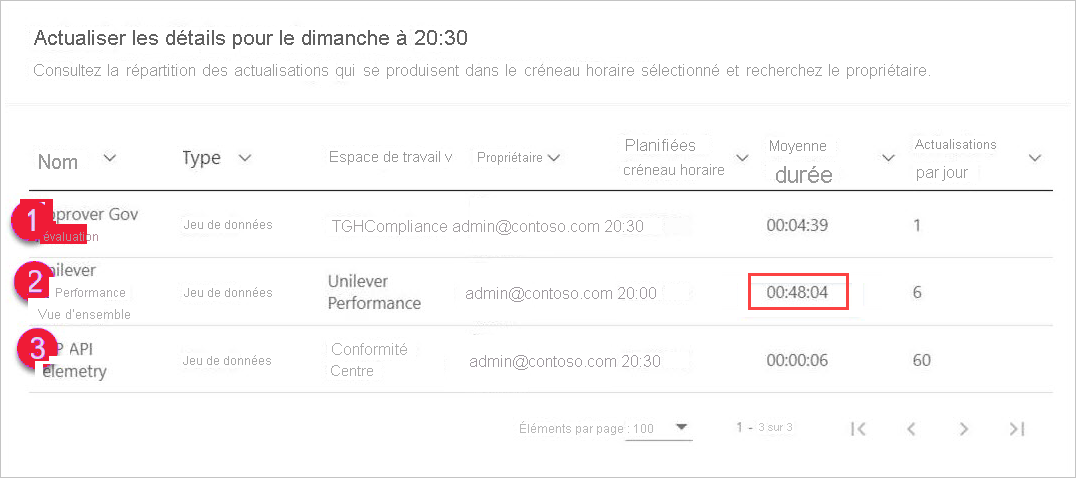 Vous pouvez sélectionner une plage horaire, puis sélectionner le bouton Détails associé pour voir quels événements d’actualisation planifiés contribuent à la durée d’actualisation réservée, ses propriétaires et à la durée nécessaire à leur exécution.
