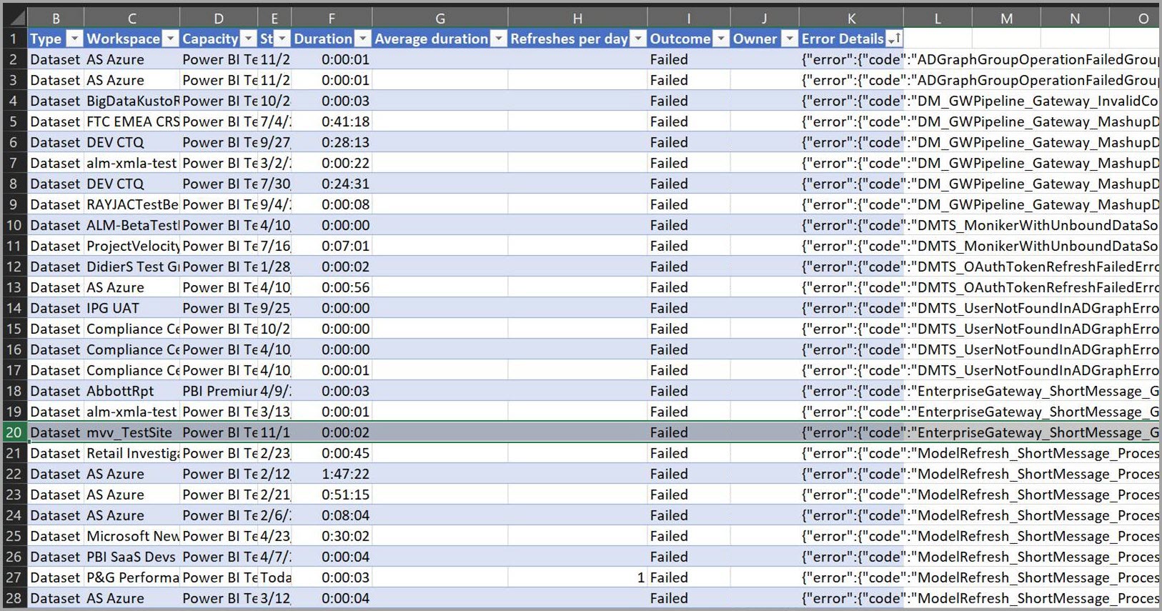 Vous pouvez également exporter des informations pour n’importe quelle actualisation planifiée vers un fichier .csv, qui inclut des informations détaillées, notamment les messages d’erreur pour chaque événement d’actualisation. L’exportation vers un fichier .csv vous permet de trier le fichier sur n’importe quelle colonne, de rechercher des mots, de trier en fonction des codes d’erreur ou des propriétaires, etc. L’image suivante montre un exemple de fichier .csv exporté.