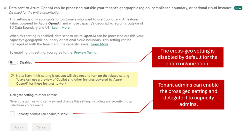 - Copilot doit être activé au niveau du locataire :« Les utilisateurs peuvent utiliser Copilot et d’autres fonctionnalités optimisées par Azure OpenAI » doivent être activés au niveau du locataire pour utiliser l’expérience autonomeCopilot. Il n’est pas suffisant de l’activer au niveau de la capacité (autrement dit, s’il a été délégué).