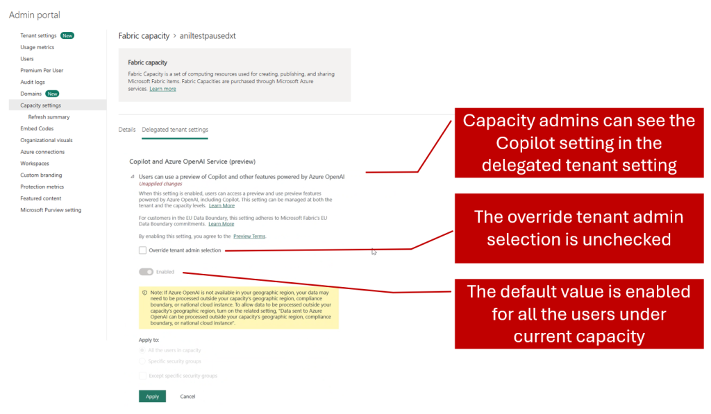 Le paramètre intergéographique reste désactivé et ne se délègue pas automatiquement aux administrateurs de capacité. Les administrateurs de capacité voient les paramètres du service Azure OpenAI (préversion) sous Paramètres de capacité, capacité Fabric, nom de capacité et paramètres du locataire délégué. Par défaut, le paramètre de capacité hérite des paramètres au niveau du locataire. Les administrateurs de capacité peuvent décider s’il faut remplacer la sélection de l’administrateur client. Cela signifie que même si Copilot n’est pas activé au niveau d’un locataire, un administrateur de capacité peut choisir d’activer Copilot pour leur capacité. Avec ce niveau de contrôle, il est plus facile de contrôler quels espaces de travail Fabric peuvent utiliser des fonctionnalités IA comme Copilot dans Microsoft Fabric.